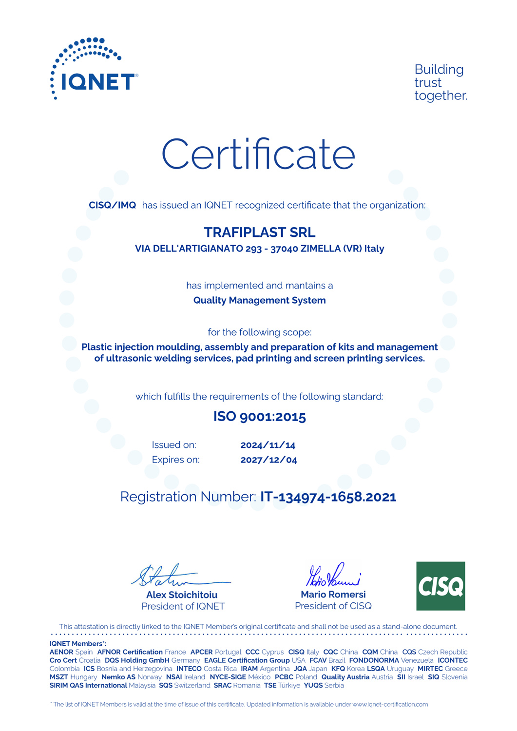 La successiva partnership con un conosciuto gruppo internazionale crea l’occasione per Trafiplast srl di sviluppare la sua realtà, aggiungendo alla produzione un’ulteriore gamma di prodotti. Questa esperienza le permette di ampliare le conoscenze nello stampaggio di materiale termoplastico e di acquisire nuove competenze nell’attività di stampaggio di materiale termoindurente.